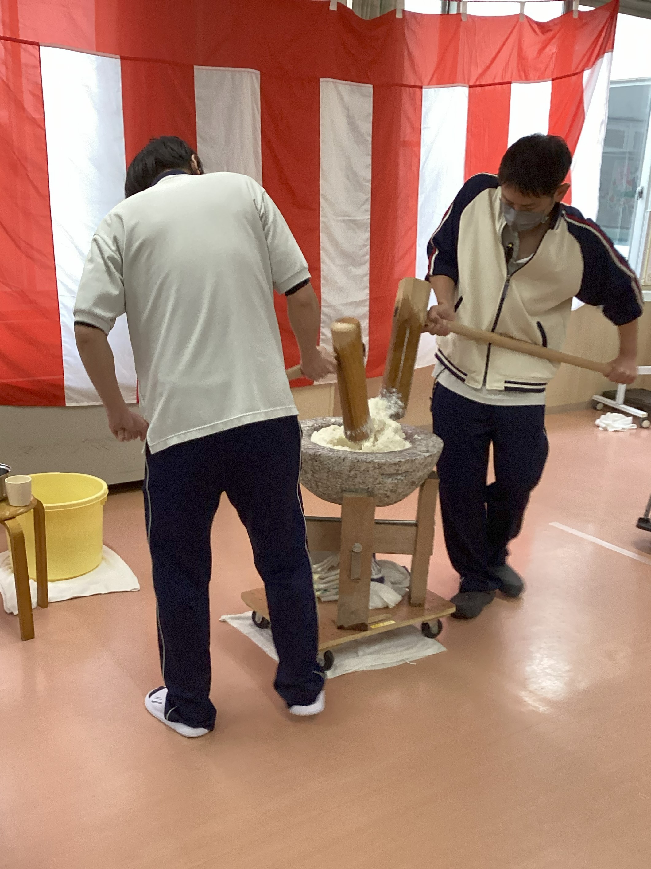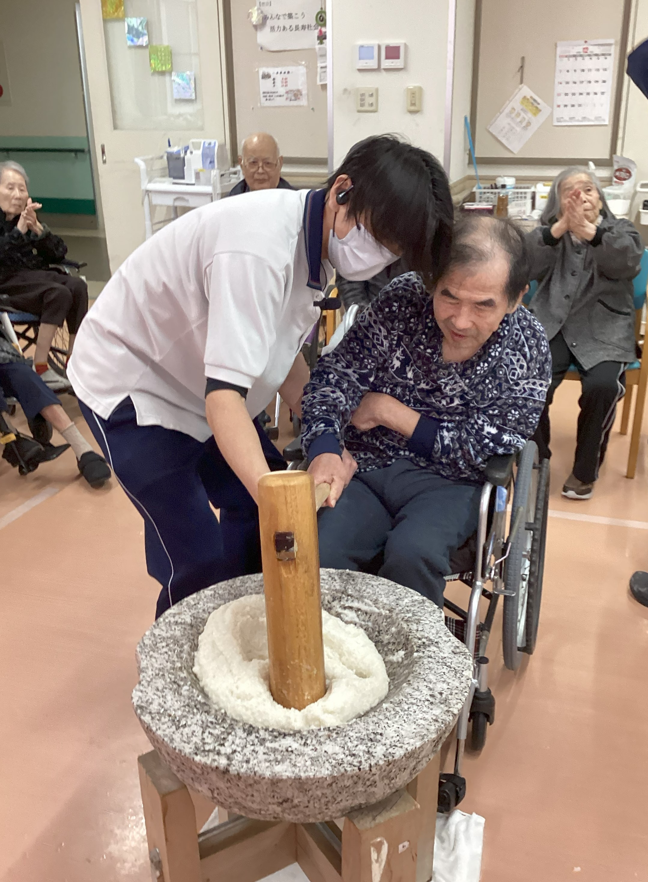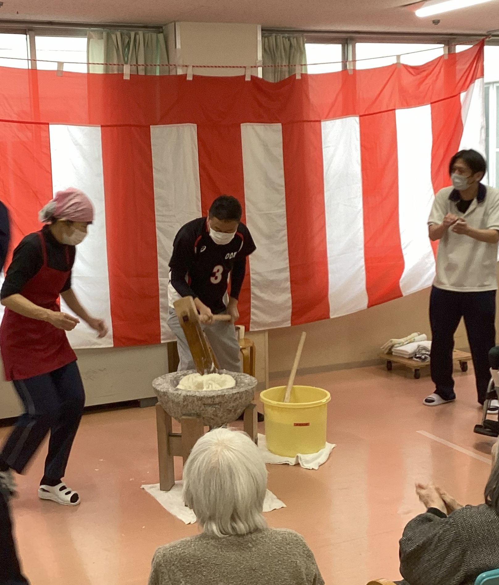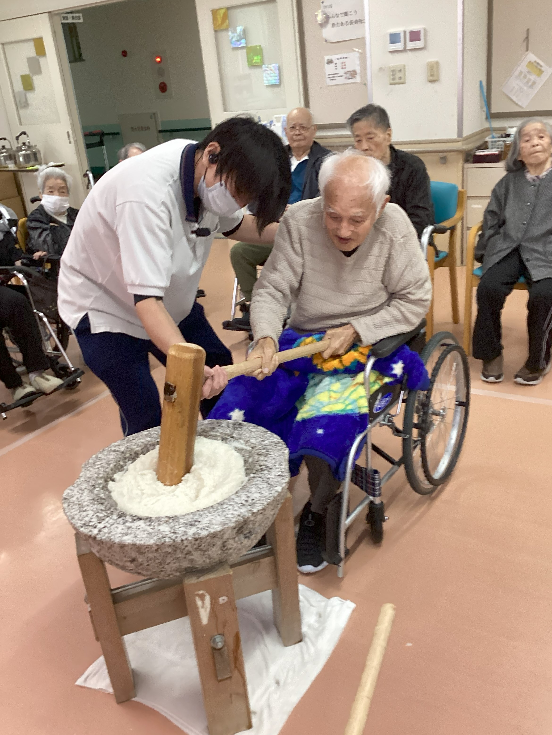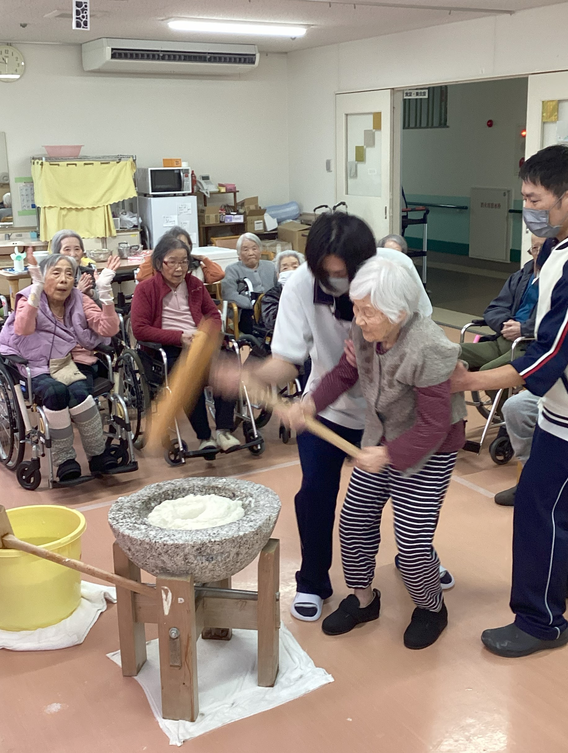 一足早く、特養では餅つき大会を開催しました。従来型・ユニット合同のにぎやかなイベントです。