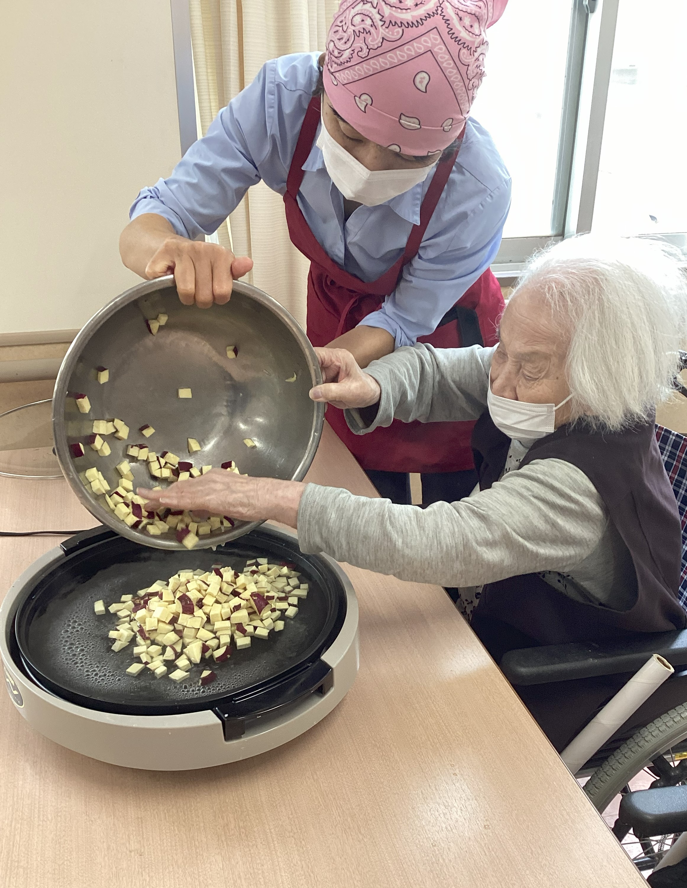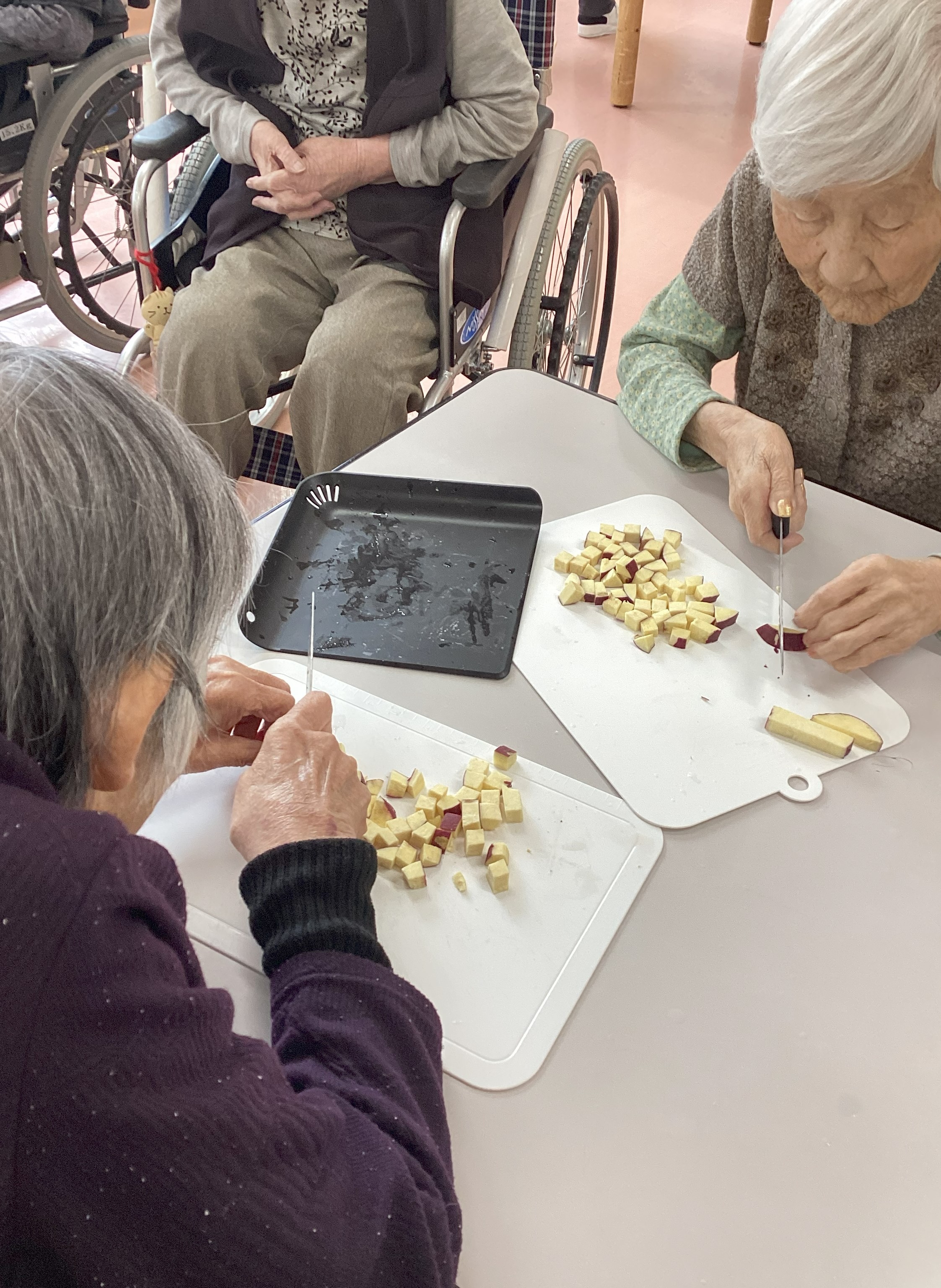 「芋が甘くておいしいな~」「昔はおにまんじゅうをよく作ったわ」「庭で落ち葉を焼いてる時に、一緒に芋も放り込んで焼き芋作ったわ~。おいしかったなぁ」と、思い出話がとまりません。