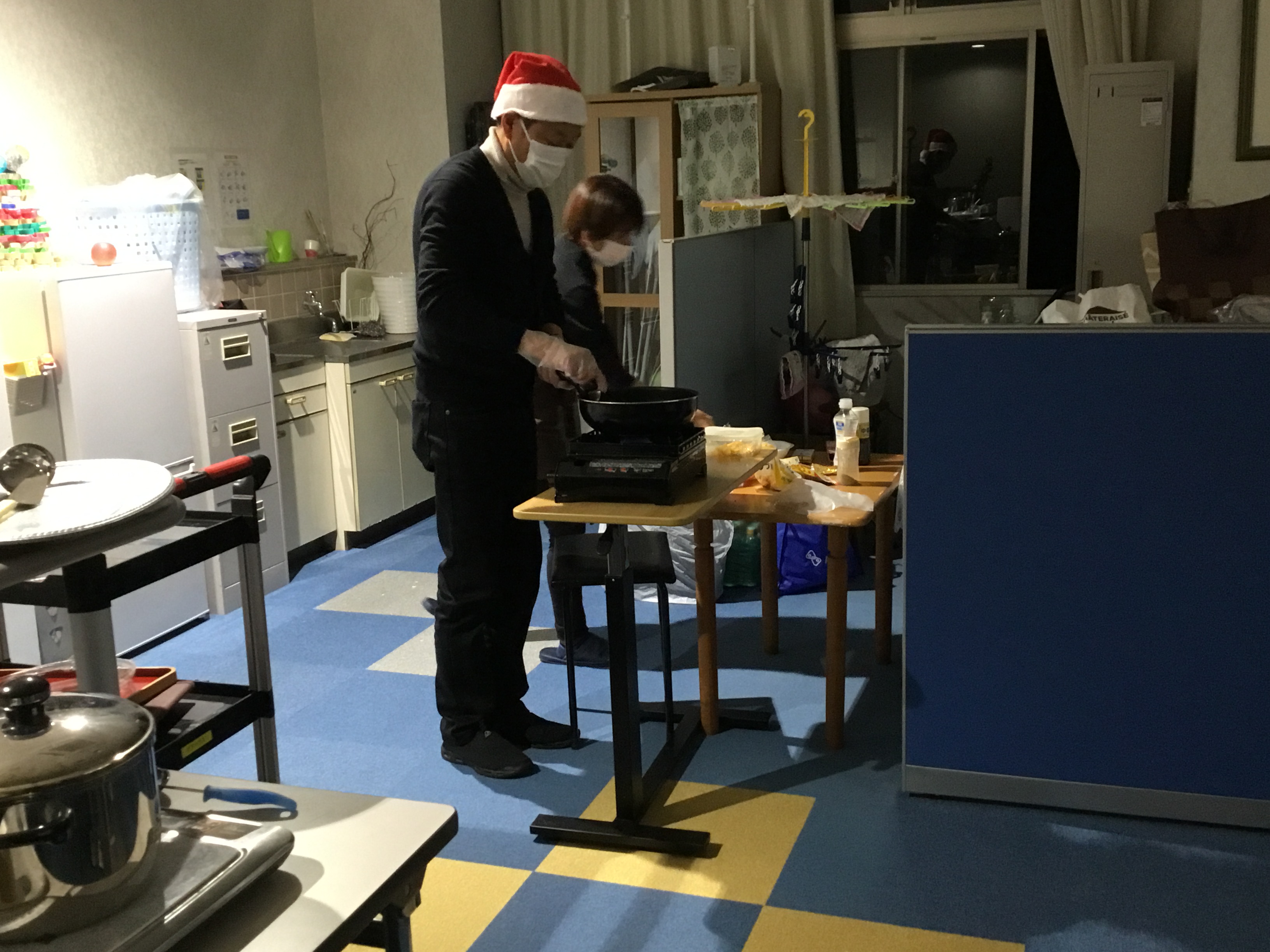 サンタ帽をかぶった理事長が、手作りでチキンライスをふるまう場面もありました。これがめっちゃ美味しい~ (さすが理事長‼)
